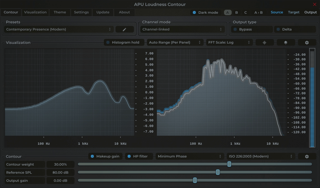 The contour tab contains configuration and visualization for loudness contours. This section details each of the individual parameters and components.