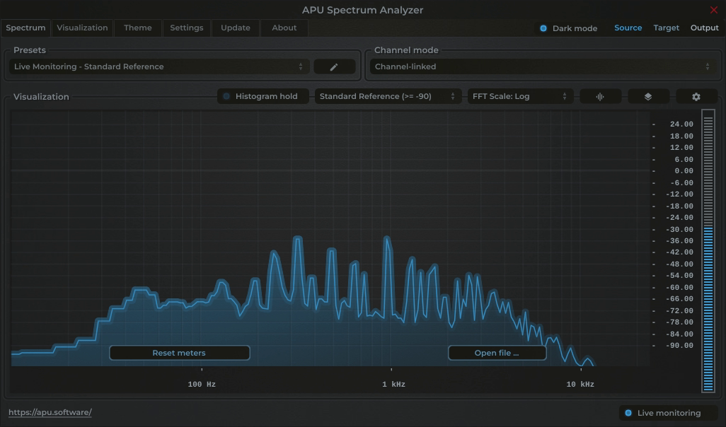 The spectrum tab contains configuration and visualization for spectral analysis. This section details each of the individual parameters and components.